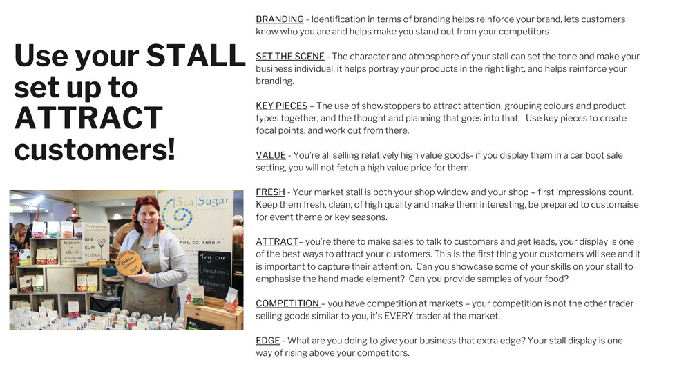 As a trader you'll have hired a stall or space at a market for a short period, you have limited time to make your sales and get your brand out there and a limited amount of space to do it in - it's important to make good use of that time to make a good impression, attract customers, get leads and make sales.